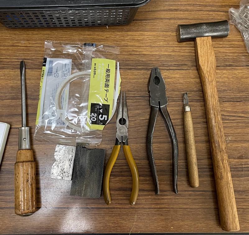 新しいスポンジ、ニッパーやペンチ、トンカチ、マイナスドライバー、ヤスリ、刃先が平らな彫刻刀(の様なもの)、両面テープ(幅9mm未満のもの)、ハサミ、しっかりした台、ツメのパーツ2個(金属の針押さえのみ)