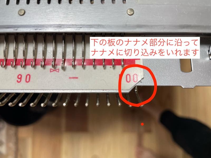 - 編み機に戻す 針を押さえながらゆっくり押し入れる